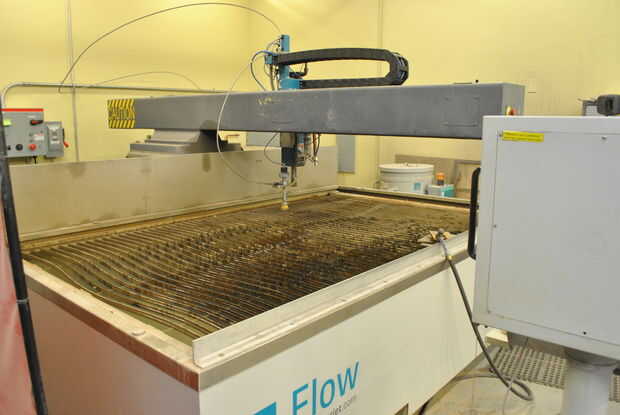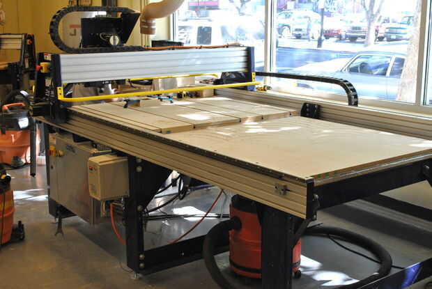 Después de ejecutar las rutas en Vcarve, le di el archivo al ShopBot (ranurador del CNC) y maneja el resto. Usé un 1/4" para los principales cortes y un 1/8" para el detalle. Uno de los objetivos de lado con este proyecto fue poner a prueba los límites de la ShopBot, y aunque me ha sorprendido gratamente por los resultados, también quería ver cómo el FlowJet maneja madera contrachapada. Puesto que la madera contrachapada es un laminado, quería probar escape entre capas de material. Con todo, ambos métodos funcionaron bien.