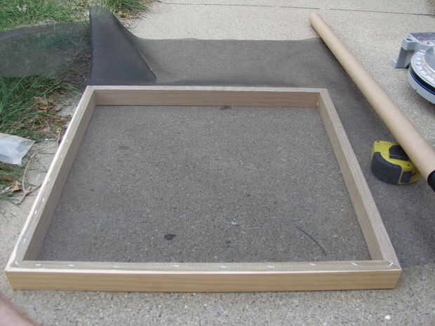 Pone la pantalla en el marco y dos pulgadas a lo largo de la estructura de la grapa siempre. Corte cualquier exceso.