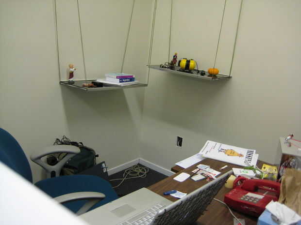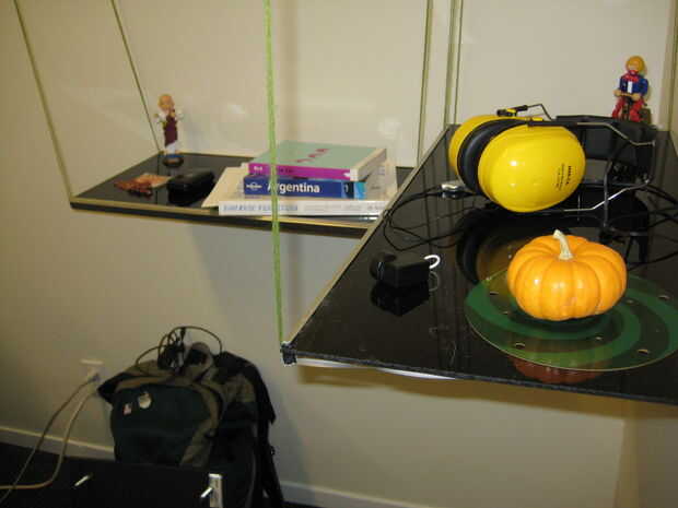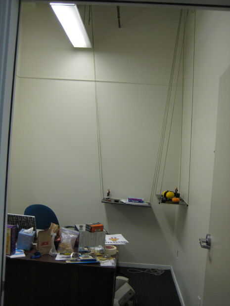 Los únicos materiales que utilicé fueron dos hojas precortadas de acrílico, sacó una fina barra de aluminio, cinta decorativa, hilado de lanas y cuatro tornillos para madera. Las herramientas que se utilizaron incluyen una sierra para metales, un par de tijeras, un destornillador, una escalera y dos sillas de oficina.