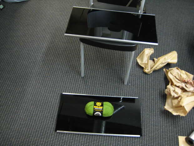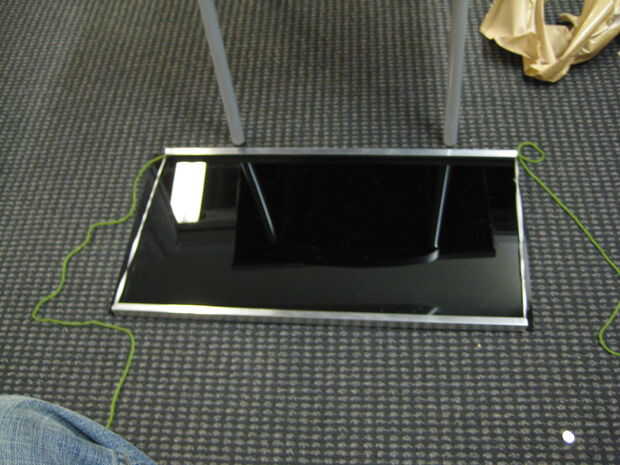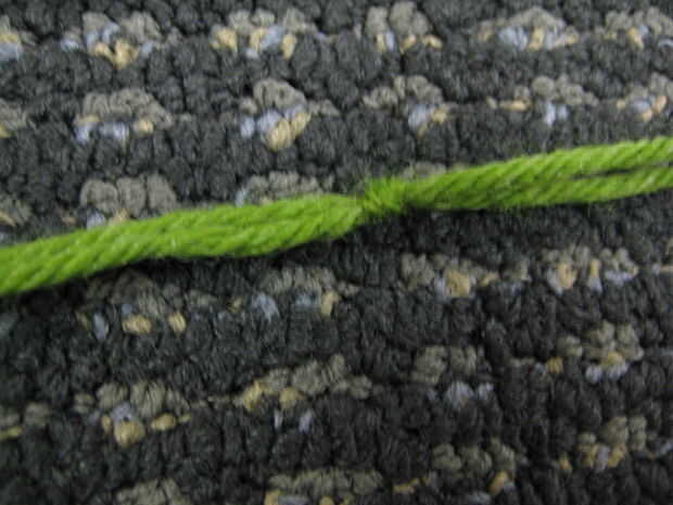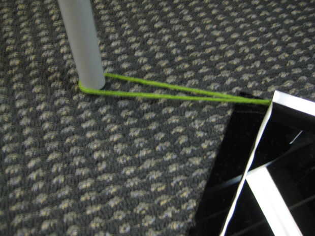 Lo que hice fue pasar el hilo de una forma a través de un lado de la protuberancia de aluminio. Una vez que lo conseguí a través de, envuelto alrededor de una pata de la silla y tiró de él hacia atrás a través de la otra manera.