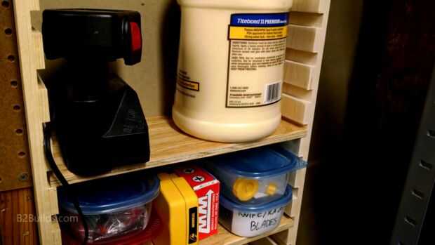 En un esfuerzo por hacer el mejor uso de un pequeño espacio de trabajo, convierten el espacio vacío entre dos montantes de pared en algunos estantes ajustables superficiales va de piso a techo. Con este diseño yo puedo fácilmente reconfigurar mis estanterías según sea necesario, sin necesidad de herramientas especiales o hardware plataforma. Mira el video para más detalles del proceso.