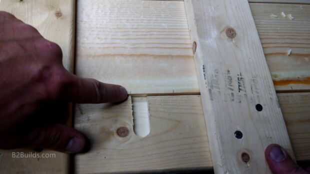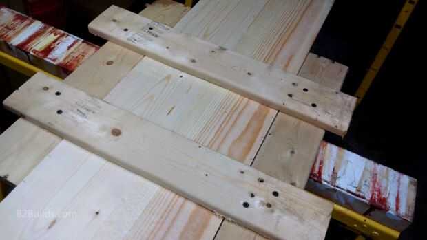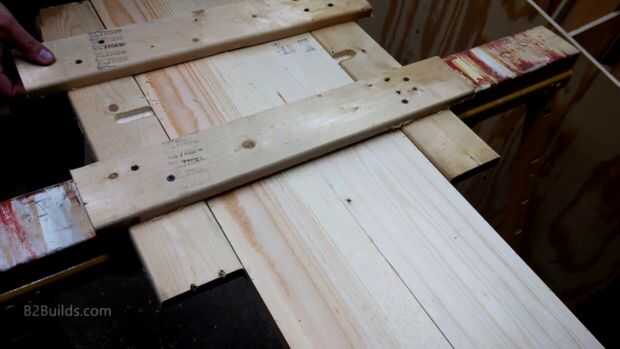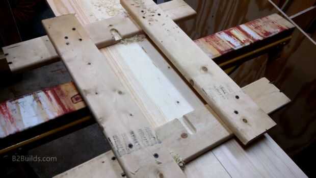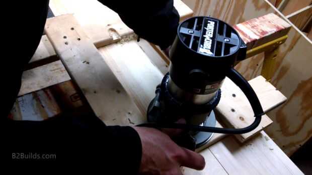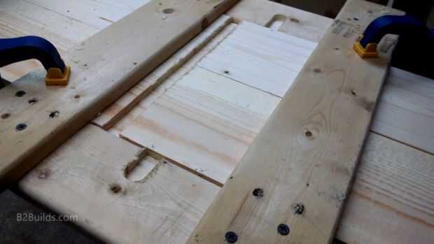 Para cortar una ranura recta en ambos tableros, necesitamos una plantilla simple que puede guiar el router a través de ambas placas. Que esta montado con cuatro piezas de tablas de palet de chatarra. Dos piezas en la parte superior de nuestras tablas y dos piezas a lo largo de los bordes exteriores de los tableros. El conjunto superior se deje que el router se deslice entre ellos, y la parte inferior dos se deslizará a lo largo de la longitud de los dos tableros.