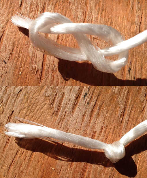 Mi cadena le gusta fray, así que poner cinta adhesiva en un extremo. Un nudo en el otro extremo de la cadena. Empezar con el nudo de la figura 8 que se muestra arriba. Prueba el nudo tratando de tirar a través de uno de los agujeros que ha perforado en la esquina. Si no va a través, eres bueno. Si exprime a través de pruebe un tapón más grande como el de oysterman.