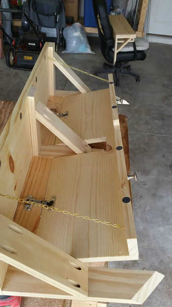 6. usando una pala de bits 5/8ths (o lo que alguna vez tamaño de hardware que está utilizando) perforó los agujeros para las bisagras y fijarse para asegurarse de que las bajadas de caída fueron al ras con el borde de la plataforma.