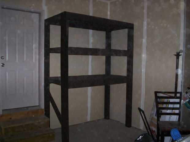 Mi hijo me pidió que le ayudara a crear algunos estantes para su garaje que incorporaría el espacio en la parte inferior para cochecitos de Parque (tienen tres hijos menores de cuatro años de edad). El diseño surgió consiste en tres "tablas" que son idénticos excepto por la longitud de las piernas. Cuando las unidades se apilan y aseguró luego uno al otro y a la pared son roca sólida, pero como tres piezas separan fácilmente se mueven alrededor de dos personas. Una ventaja potencial de la configuración es que las unidades podrían usarse como tablas sacando los tornillos de anclaje y desapilado les.