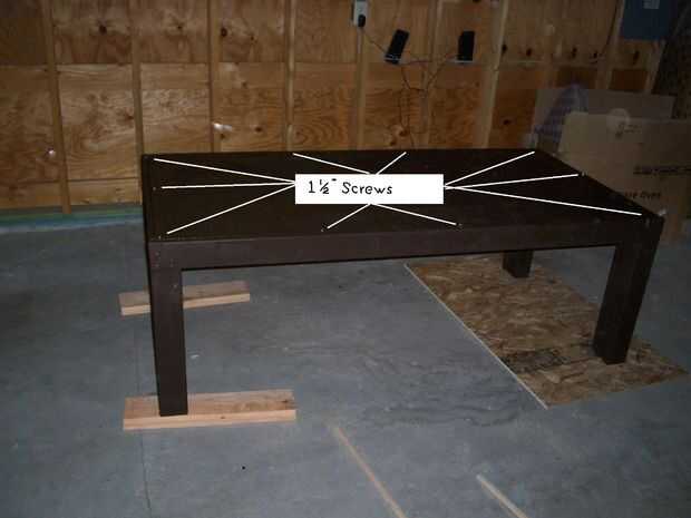 Voltee el marco y coloque sobre sus patas. Si el OSB no queda en el marco, reemplace con el lado liso hacia arriba. Ahora es el momento para asegurarse de que el marco es cuadrado. Medir la mesa diagonalmente desde la esquina superior izquierda a la derecha y de arriba a la derecha a la parte inferior izquierda. Las dos medidas diagonales será el mismo si la mesa es cuadrada. Si no lo están, golpee las dos esquinas en la dimensión más larga hacia el uno con el otro hasta que estén. Una vez que todo está cuadrado, taladre agujeros piloto e Instale tornillos de 1 1/2 pulgadas a través del OSB en los rieles. He utilizado uno en cada esquina, dos en cada lado largo y uno a cada lado corto.