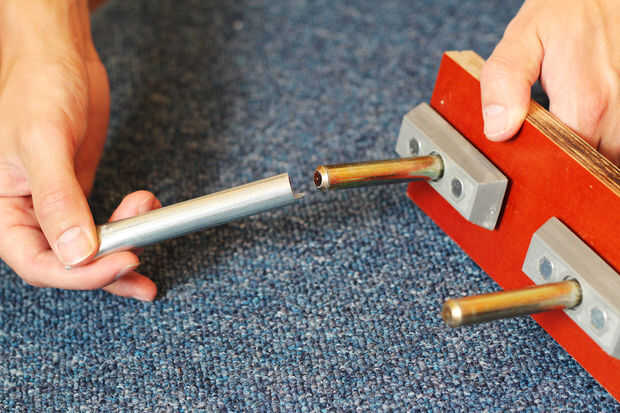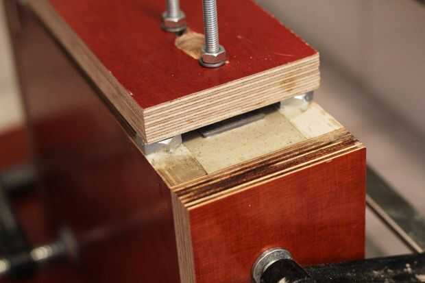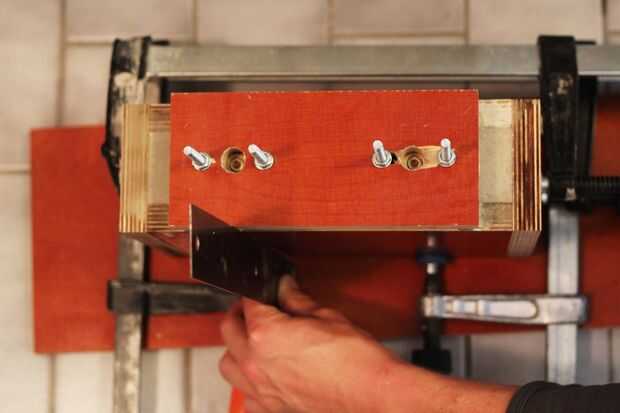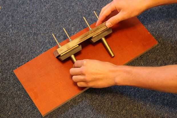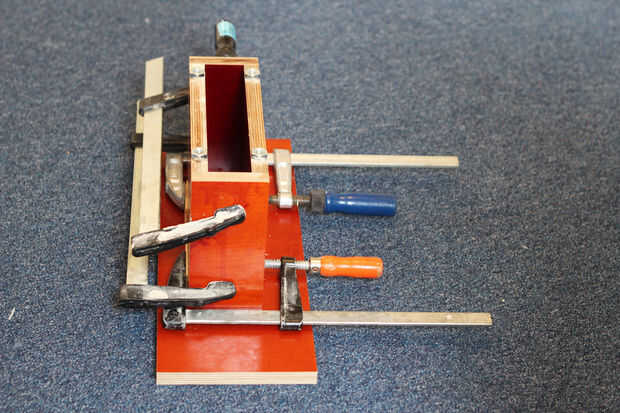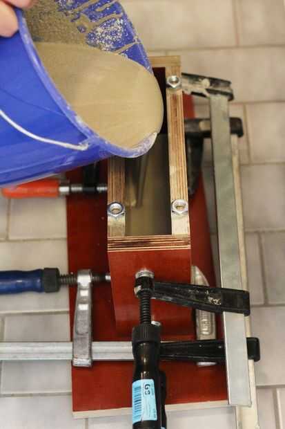 Asegúrese de que los soportes se colocan paralelos a la superficie de la plataforma. Usted puede hacer esto mediante la alineación de la pieza de madera contrachapada para el molde (ver imagen).