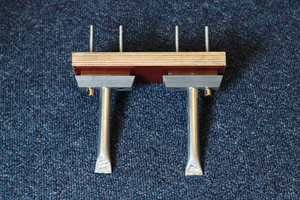 Comenzar con la instalación de los soportes y tornillos de la pieza impresa en 3D en la madera contrachapada con el M6. Porque los agujeros son perforado 7mm hay un poco de espacio para alinear los dos soportes. Colocando la pieza sobre una superficie plana se puede sentir si se tambalea. Cuando no hay ningún bamboleo está seguro que los dos soportes están a la misma altura (ver foto).