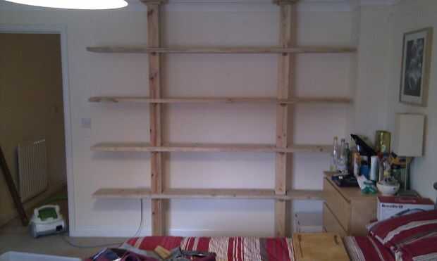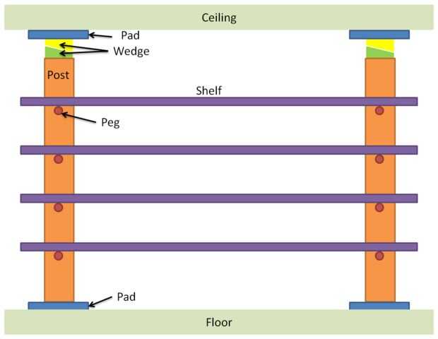 La cuña de diseño básica puestos de algunos vertical entre el piso y sellado y colgar algunos estantes de ellos.