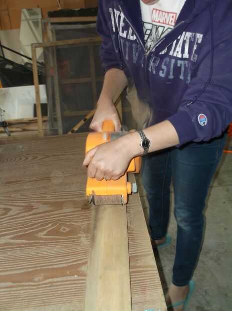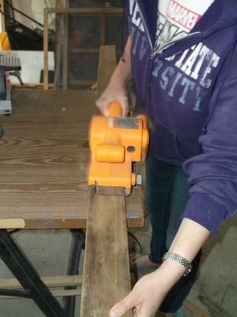 La madera estaba muy sucia y necesario para limpiar y alisa. Una lijadora de banda era simplemente la herramienta adecuada para ello. Podríamos haber utilizado una lijadora de Palma, pero la lijadora de correa hizo un trabajo más rápido y mejor. Era más fácil de arena todo el tablero a la vez con la lijadora de banda, así que hicimos el lijado basto antes de cortar los listones cerca para arriba. Lije todas las partes de la madera. No esperes un fino acabado, lijado fino que hicimos con la lijadora de Palma.