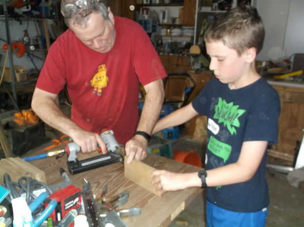Construimos los estantes con una clavadora de clavos, grapas de 1". Nos podríamos haber pegado, pero esto fue mucho más fácil.