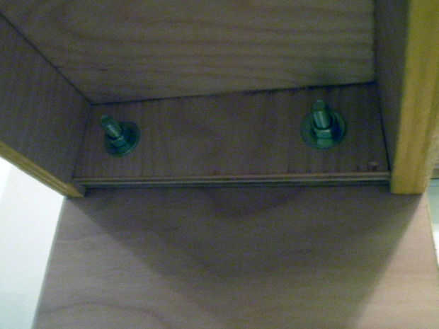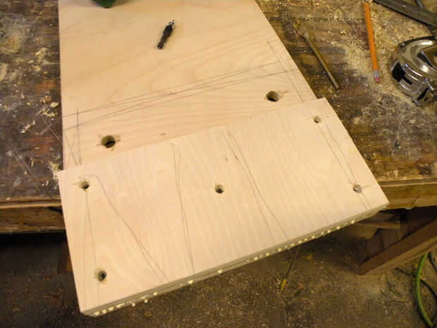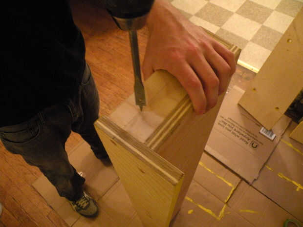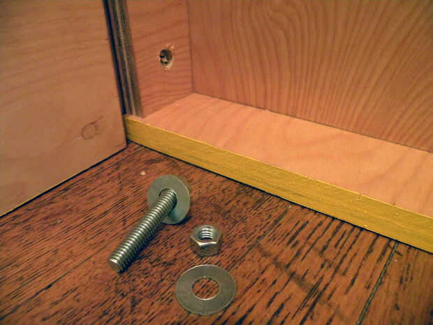 Haga dos agujeros en cada línea, empezando con un cajeado 1" que sólo pasa parcialmente por la pieza, luego siguiente con un 1/2" agujero de perno que atraviesa completamente la pieza. Usando un perno de 3/8", 1/2" agujero proporcionará habitación de tolerancia para los estantes. El agujero de diámetro superficial 1" es tamaño perfecto para un 3/8" corte lavadora. Perforaciones correspondientes 1/2" en los lados de las cajas del estante.
