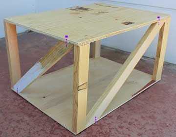 He intentado enroscar los tornillos de madera sin perforación previa pero que no funcionó tan bien. Agujeros y me luego atornillar para sujetar las abrazaderas de ángulo. La púrpura en la imagen muestra donde van los tornillos en la madera. Las cabezas son visibles.