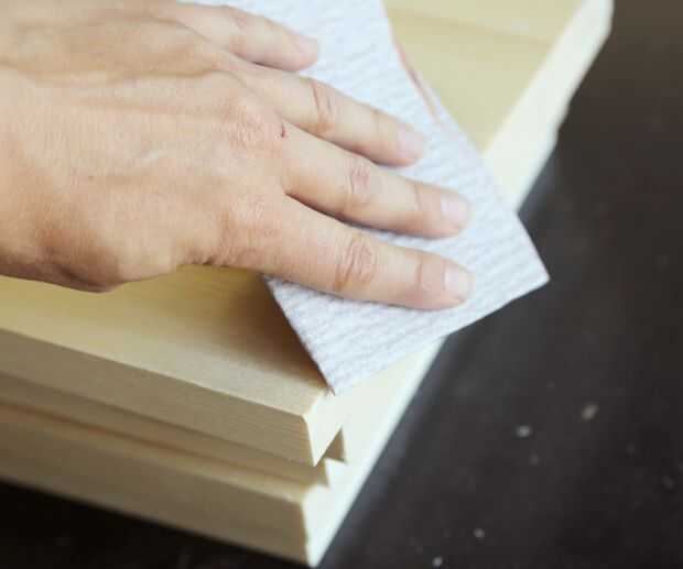 Utilice un papel de arena de grano mediano (yo usé 220) para suavizar todos los bordes de cada estante.