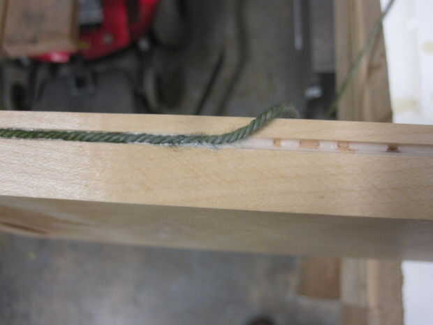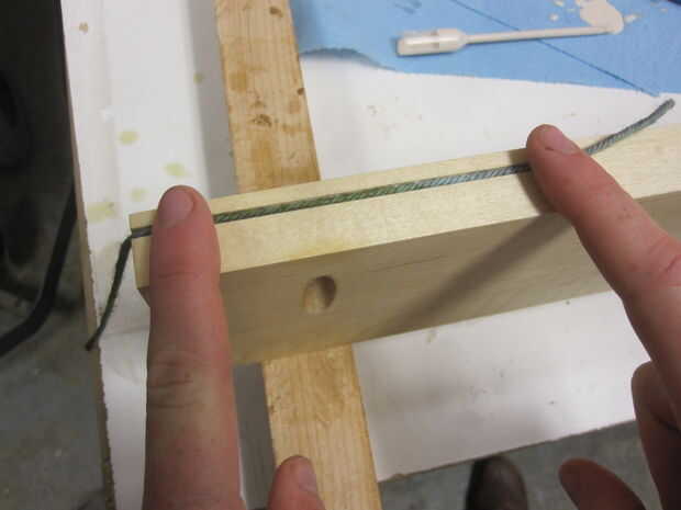 Poner el hilo en la arboleda por la tabla vio colocar puntos pequeños de pegamento blanco en el camino para mantenerlo en.  Envuelva el hilo alrededor de la esquina bien y terminar en la arboleda en la parte posterior de la plataforma.