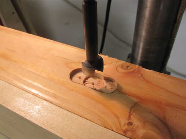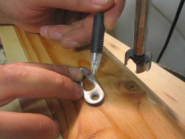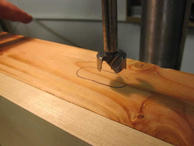 Rastrear el gancho del ojo de la cerradura, una pieza Forstner de carga en el taladro, ajuste la profundidad para no quitar demasiado material y perforar para extraer la madera dentro de la línea de lápiz.