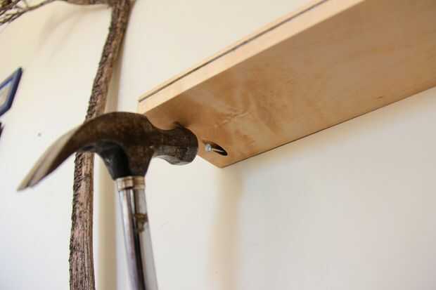 Asegúrese de que el estante esté nivelado. Una vez, marque un punto en la pared a través del agujero del bolsillo en el extremo de la plataforma. Un lápiz muy flaco trabajar para esto, pero utiliza un martillo y un clavo y había golpeada ligeramente una pequeña abolladura en la pared donde debe ir el ancla.