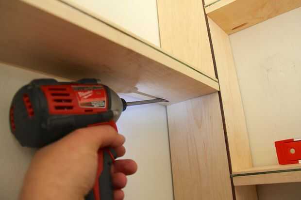 Tomar un tornillo Kreg y conducir a través de los agujeros en el poste. Elegí atornillar algo esta conexión y luego usar pegamento en caso de que alguna vez quiero pasar esta cosa en una pared diferente. Simplemente volver a instalar requiere esta conexión que puede deshacer desde el ancla para el estante en el extremo tiene que ser puesto en el estante de en medio.