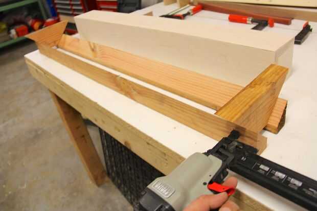 Cortar un trozo de madera de desecho a la mitad en la Sierra de mesa con la hoja a 45 grados. Longitud de la madera debe ser 4" ya entonces el poste de la esquina.
