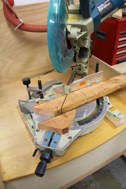 Dirígete a la Sierra de picar y cortar dos piezas triangulares de 2 x 4 (foto arriba) con el conjunto de sierra a 45 grados, así.