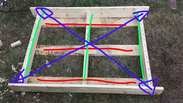 5. Voltee todo el asunto sobre su parte posterior y asegúrese de que está todo cuadrado midiendo en ambos la diagonal (de esquina a esquina azules flechas) y asegurándose de que es el mismo.