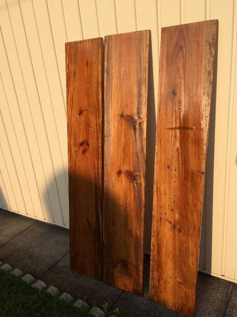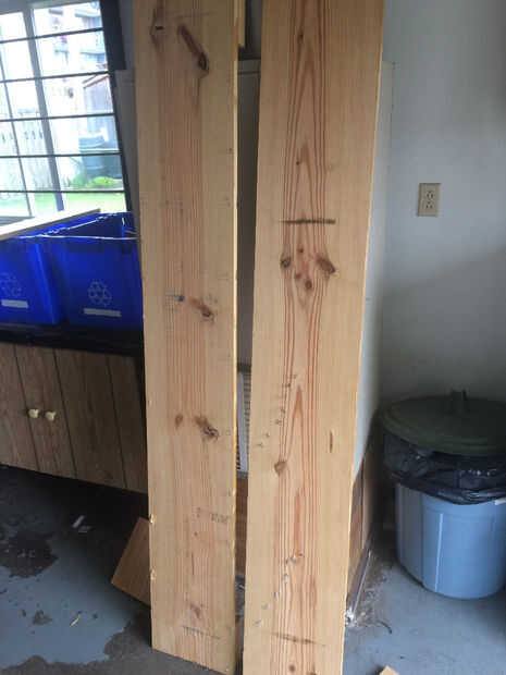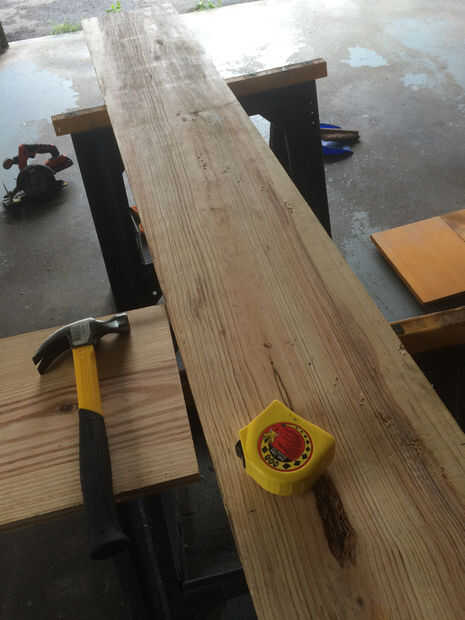 Para los Top 3 estantes usé madera de pino que tengo de y resbalón industrial usado para sostener una gran pieza de acero. La plataforma tenía un montón de cortes y arboledas profundas en lo que fue perfecto para lo que quería. Junto con los cortes y raspaduras ya en la madera hubo varias grapas que tuvieron que ser quitado. Después de quitar las grapas corté las tablas hasta el tamaño final que para mí fue 63 y 1/4 de pulgada. Usé la misma medida como la plataforma existente que antes quité del armario.