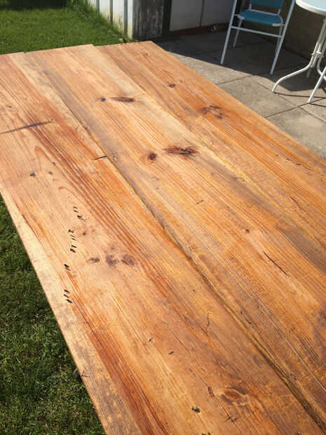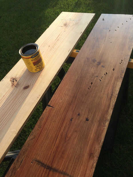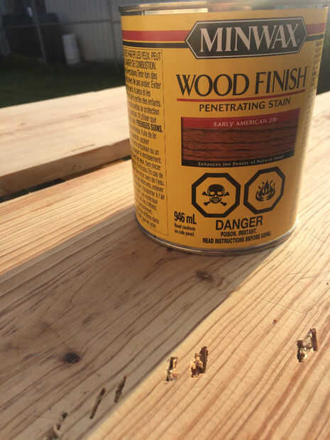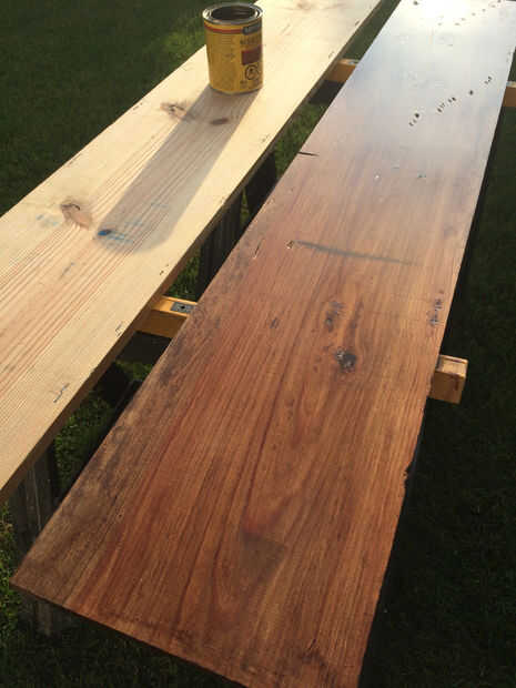 Mediante una tinción de minwax penetrante (temprano americano) había teñido cada pedazo de madera en ambos lados, así como todos los bordes y les permitía secar en el sol y durante la noche mientras trabajaba en el estante más bajo.