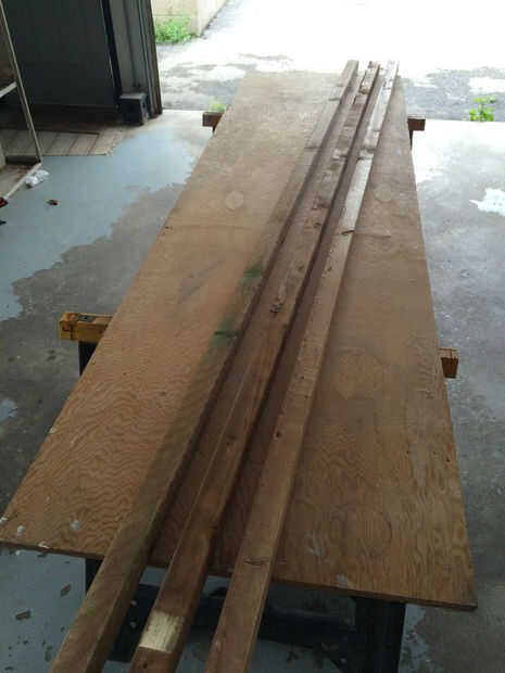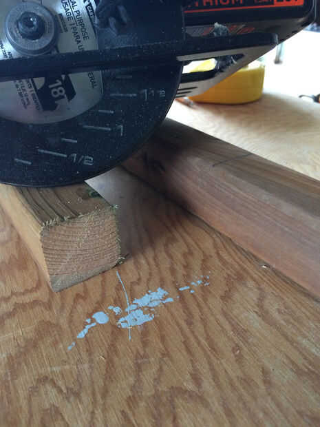 7 - colocar un trozo de madera a través de las juntas para hacer una línea de guía para facilitar el corte. cuidadosamente usando una sierra de habilidad cortar los extremos de los tableros para hacerlos todos iguales y a la longitud correcta.