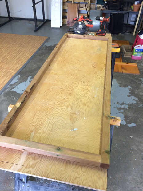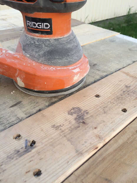 9 - usando una lijadora de Palma poder arena el estante de la plataforma ahora construido en preparación para la mancha.