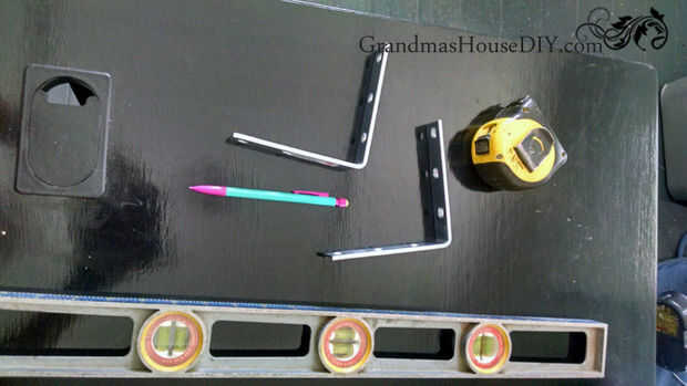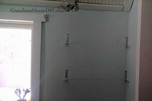 Utilizando un lápiz, una cinta métrica y nivel, decidí trabajar dibujo mis líneas a lo largo de la pared donde colgaría cada estante y encontrar mis vigas. Yo sabía que siempre tendría un poste de madera en las esquinas para golpear pero también sabía que tenía que encontrar al menos uno más para estos estantes para poder sostener cualquier tipo de peso real. Con las líneas dibujadas, puse mis soportes con tornillos de tres pulgadas en los postes. (Realmente no quería estar en la cama alguna noche para oír el choque de mis estanterías de madera de granero caer al piso.)