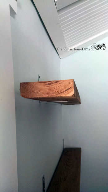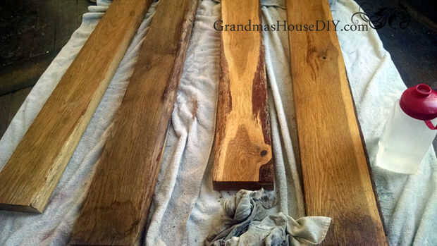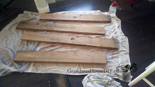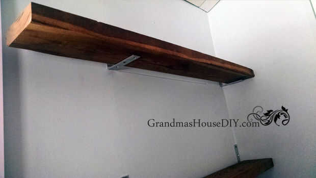 A partir de ahí me dirigí al establo para ver qué abuelo guardado para mí que trabaja en este proyecto. De repente mis estanterías ahora, fueron sin duda: estantes de madera libro de granero! Agarré la madera necesitaba y les corte a la longitud (con mi sierra para cortar ingletes en el sótano) y luego poner en toallas en nuestra cocina porque estaban absolutamente asquerosos.