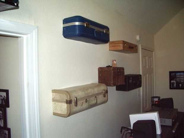 Ella consiguió realmente, esta idea de una revista--cortar algunas maletas viejas y hacer estantes fuera de ellos. Comenzó a acumular unas maletas antiguas (y un caso de tren y una vieja caja madera) y decidí hacer estos y montar sobre la pared en nuestra sala de prensa.