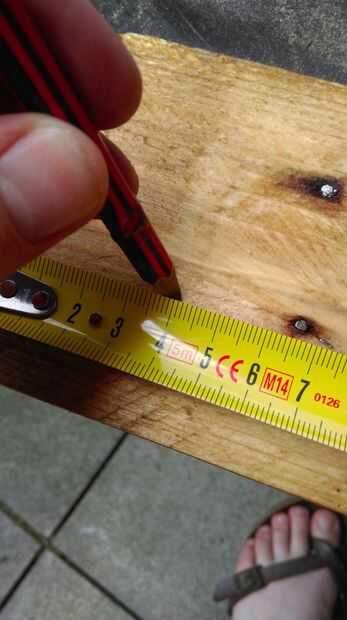 Toma el listón marcado 1 y medir 4 cm de cada lado. Perfore agujeros a través de la Junta en medio de las marcas a altura.