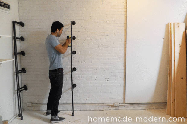 Utilice un nivel para asegurarse de que los tubos son verticales antes de atornillar las bridas a la pared. Si sus paredes son de tablero de yeso, uso tarugos.
