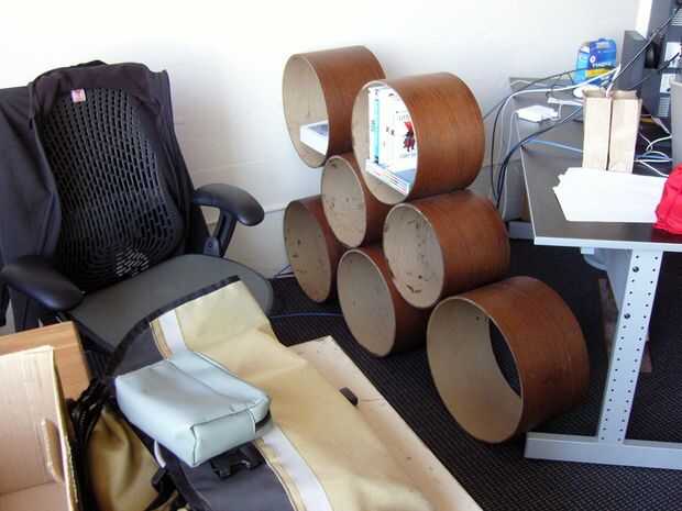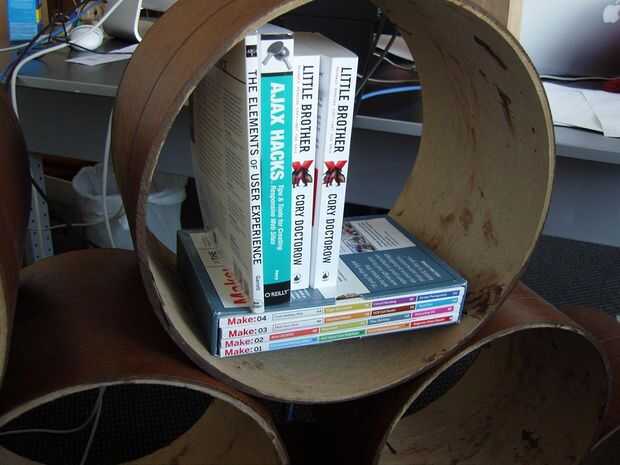 Desde que nos mudamos a la nueva oficina y necesitaba algunos estantes nuevos, sin embargo, decidí utilizarlos para tal fin hasta que se a robo de nuevo. Vi un sistema de estantería en un blog de diseño que parecía clase de esto, que fue mi inspiración. Trabajan muy bien; pie de escritorio de Rachel evita que se derrame en el suelo en un gran montón de libros.