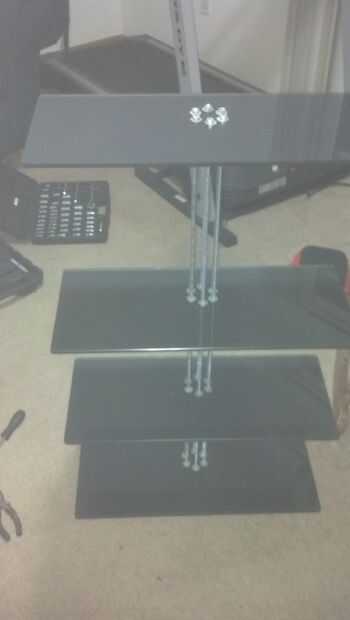 Dos octágono postes soporte 3 niveles de vidrio estantes, soportes de estante de roble personalizados, routered roble base y personalizados pies/soportes.Los postes dos octágono fueron rescatados, creo que eran para una cama. La parte superior e infe