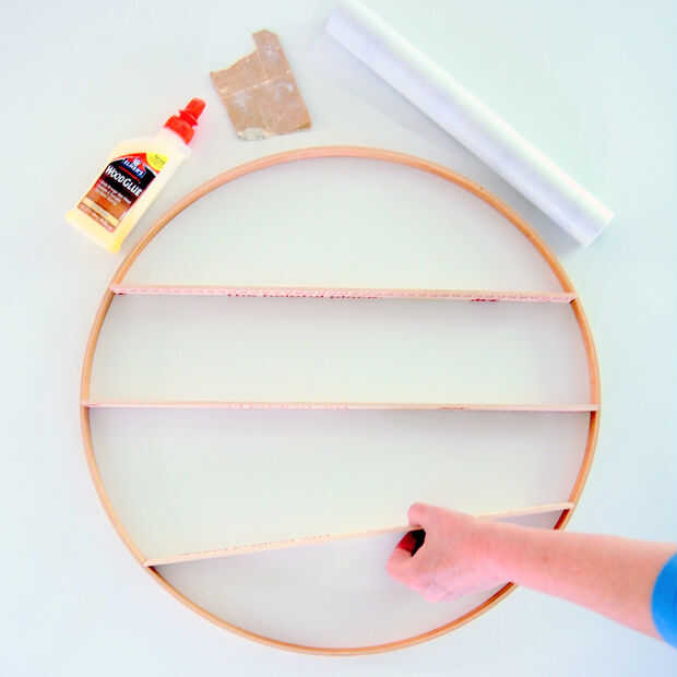 Utilice un palillo de brocheta o paleta para aplicar pegamento en el aro y el pedazo de regla donde las 2 superficies toquen y luego deslice el estante en su lugar.