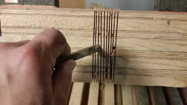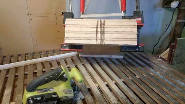 He atornillado en los extremos de los estantes de 1 x 2 y corte muescas de media caña con mi sierra circular. Sólo se cortan en las líneas, entonces tantos cortes como puede caber entre ellos. Utilizar un cincel o un destornillador para romper las piezas y la sierra hacia adelante y hacia atrás hacia los lados en los cortes para limpiar para arriba. Sujeta los estantes juntos por lo que pude cortarlas todas a la vez