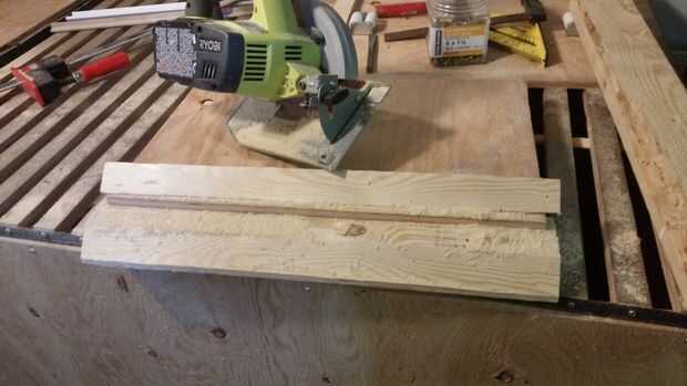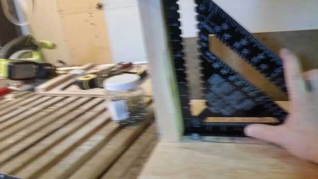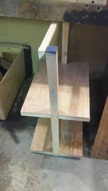 Después de cortar las juntas de media caña en 2 x 2 al igual que los estantes, I cuadrado y fijar los estantes a las patas de 2 x 2, pretaladrado y les atornilladas. Para los reguladores del Cala francés atornillado una pieza recta de madera a un trozo de 2 x 4 y corte 45 aproximadamente 1 1/2" del borde volteado el 2 x 4, atornillado a la madera contrachapada a él otra vez y cortar el resto de la Cala. Jodido una mitad a la parte superior de 2 x 2. Cuando corté las calas, les hice unos 6" demasiado largo y corte off extra para usar en los ganchos. Las calas en realidad no llevan peso, están sólo como guías para los estantes correr rectos y equilibran los estantes así que sólo necesitaba 2 ruedas debajo de cada uno.
