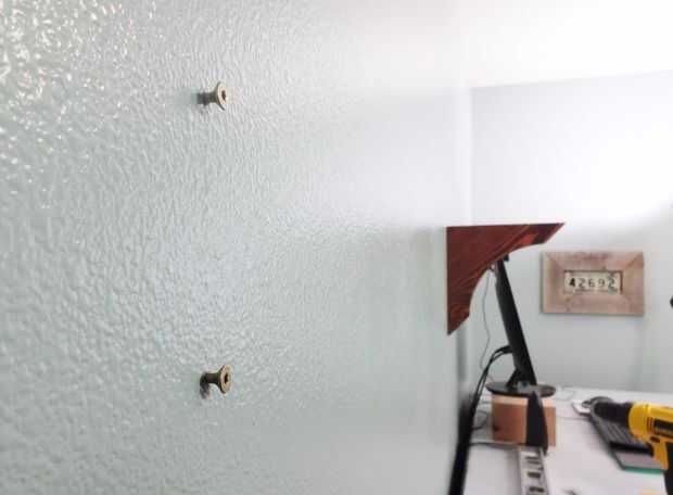 En cada uno de estos lugares, he instalado un tornillo #10 de 3 pulgadas, dejando las cabezas que sobresalen de la pared de 3/8".