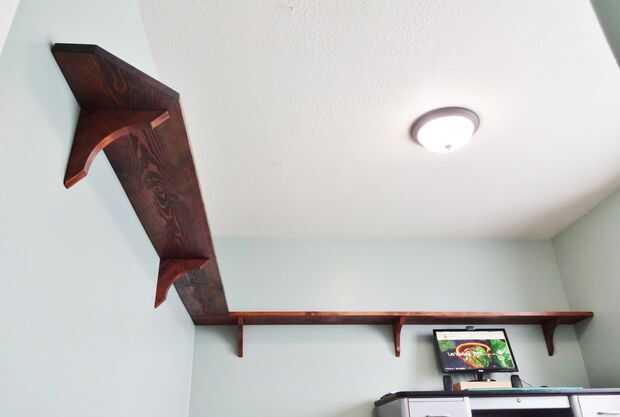 En la esquina, dos estantes se unieron junto a un pequeño conjunto de media caña que eliminó la necesidad de un tercer soporte en la pared lateral.