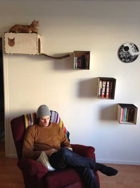 Moe le gusta casillas y lugares altos. Mi hermano y su novia querían un lugar para almacenar sus favoritos libros y comics. Estos estantes parecían la solución perfecta para hacerlos felices.