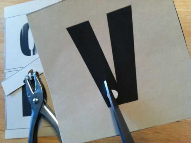 Usando un sacador de papel estándar/pequeño círculo, hacer un agujero en la carta. Esto le dará un lugar para insertar tus tijeras así que usted puede cortar la carta con flexión o rasgado de su plantilla.