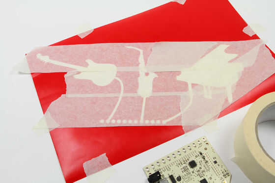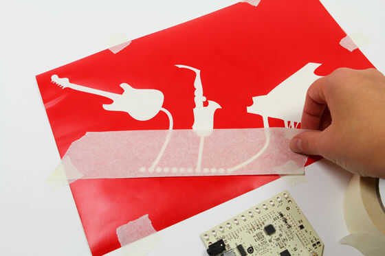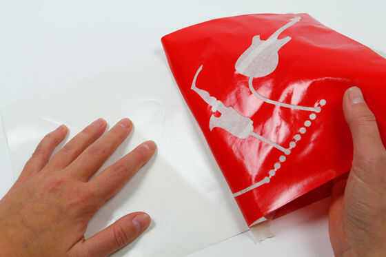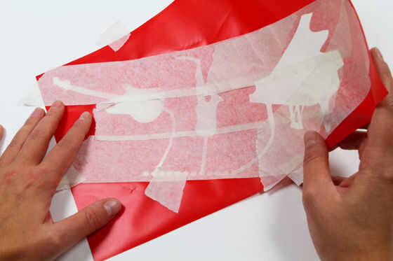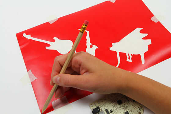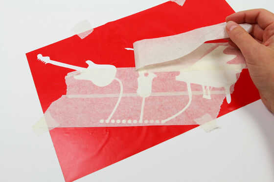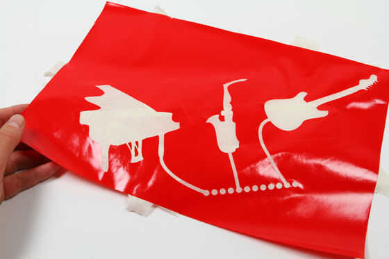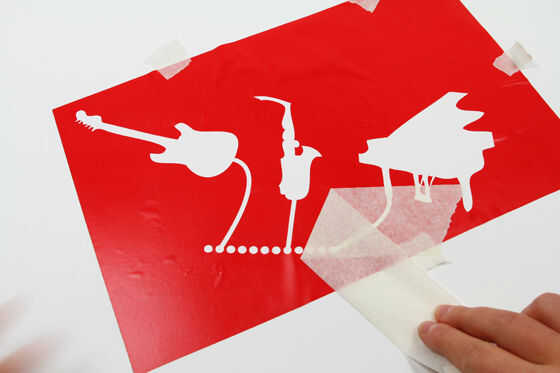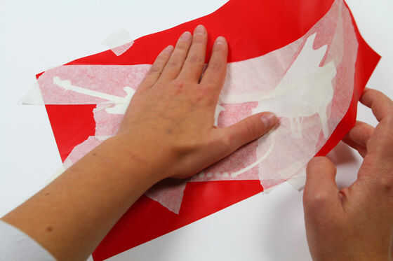 Establecer la plantilla y marca las esquinas con un lápiz. Pegue cinta adhesiva sobre la parte superior del vinilo, para cuando se retire la hoja del forro que todo permanece juntos. A continuación pelar el vinilo de la hoja del forro. El lado pegajoso para que sea un poco menos pegajoso así que usted puede pelar el papel después de la pintura sin dañarlo de la pelusa. Puede hacer esto por pegarse a la ropa un par de veces. Una vez que es un poco menos palo pegajoso, hacia abajo hasta su papel, haciendo coincidir las esquinas con tú lápiz marcas. Luego retire la cinta adhesiva para revelar el papel debajo.