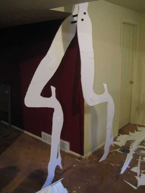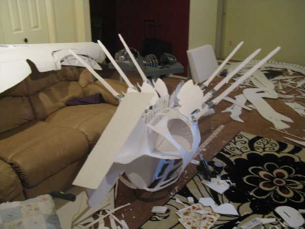 esto es una gran estatua de Velociraptor (modelado después de la versión de Parque Jurásico) hizo sobre todo de placas de espuma, tiras de yeso y pintura de aerosol. Primero había hecho una cabeza de T-rex con un método similar. Fue con esta cabeza d
