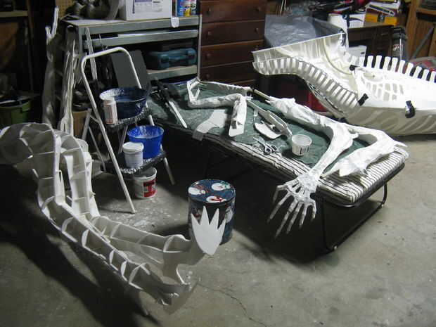 Hola a todos, aquí hay unas fotos de un guerrero alienígena y huevos de la película 'Aliens' que mi novia y yo para nuestra fiesta de Halloweenel extranjero está construido de alambre de pollo, luego papel mached luego detalle añadido mediante pegame