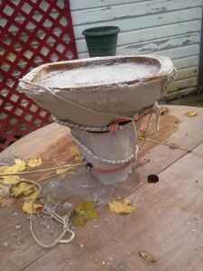A continuación, mezclar algunos ultracal yeso piedra o algún concreto (no piedras agregadas, sólo arenas y cemento con algunas fortificante acrílico añadido). Vierta en el molde en pasos y rotar y vibrar el molde lo mejor puede para sacar las burbujas de aire y entrar en todos los rincones y grietas.