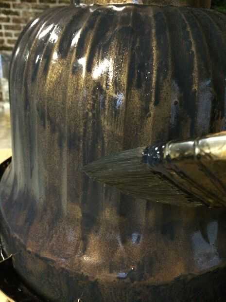 La capa superior es una aprox. 75% de agua diluida turquesa pintura rociada en todos los artículos con un atomizador de squeeze. Este método creará una pátina en una formación natural. Decubierto 2-3 veces más hasta que me dieron el aspecto que deseaba.