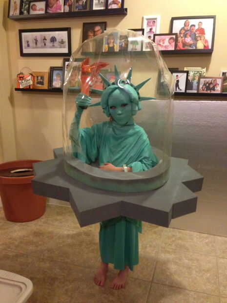 en medio de la toma de espuma interna (que hemos cortadas para formar la rosquilla) cortamos un pequeño orificio se deslice sobre la cabeza de nuestra hija. Este agujero debe ser tan pequeño como sea posible por lo que fue ajustado cuando alrededor de la cintura porque esto realmente iba a ser lo único que sostenía la cúpula mientras ella estaba en traje.