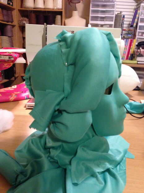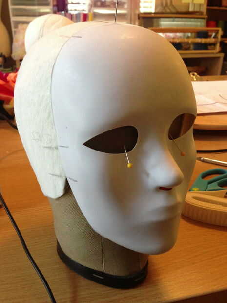 Siguiente la máscara. Comenzamos con una máscara de plástico blanca, básica. Esto nos une a un casquillo del cráneo de FossShape. Luego cortar la corona de espuma de embarcaciones y cubren todas las piezas en la misma tela verde que se hizo el vestido de. La peluca fue construida de rollos de tela que luego también fueron cubiertas en tela verde.
